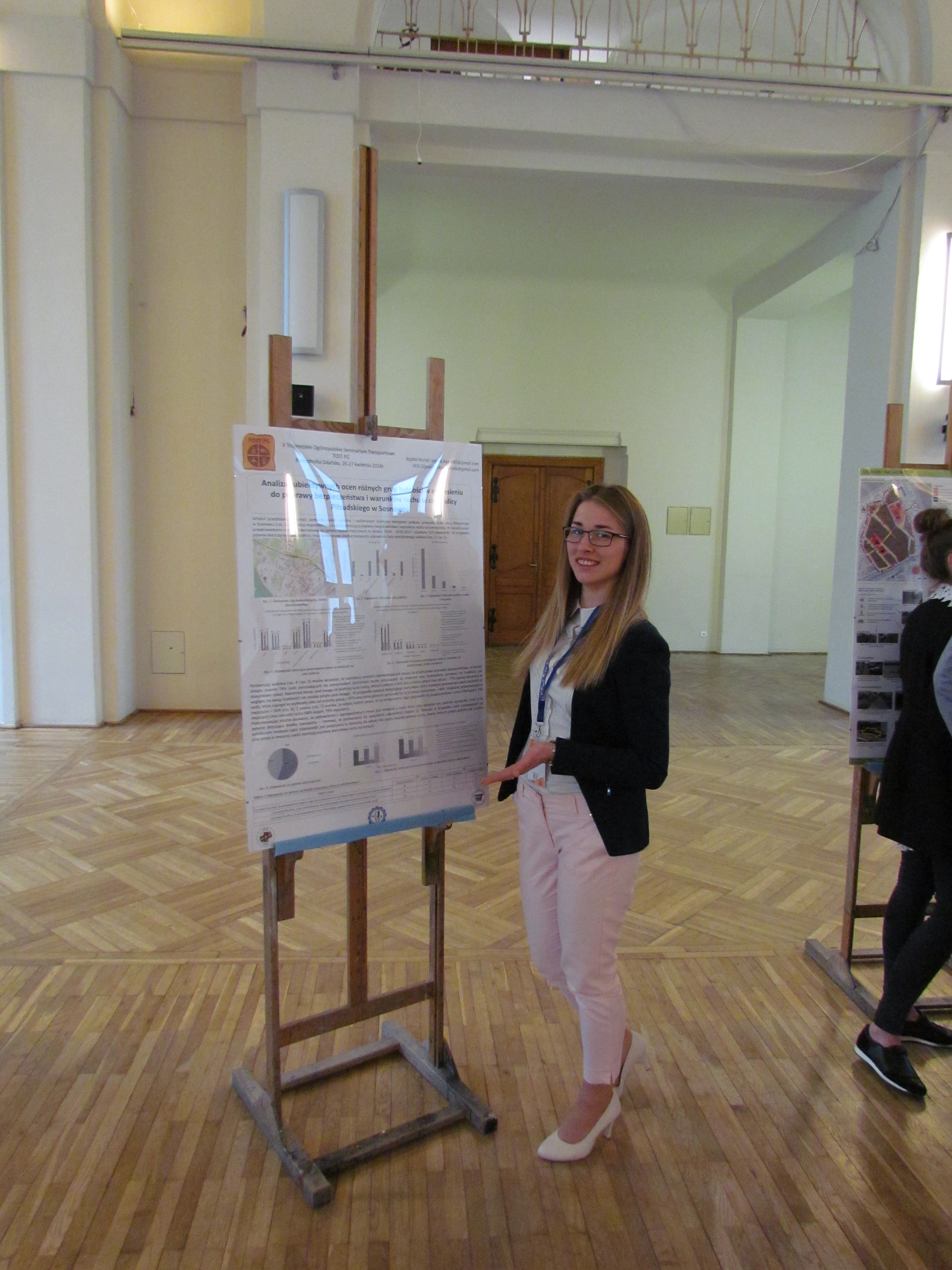 Pierwszego dnia odbyły się trzy sesje referatowe i jedna posterowa. W sesji posterowej swój plakat pt.: "Analiza subiektywnych ocen różnych grup ludności w odniesieniu do poprawy bezpieczeństwa i warunków ruchu w ciągu ulicy Piłsudskiego w Sosnowcu" przedstawiła nasza koleżanka - Agata Kurek.